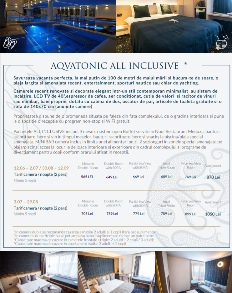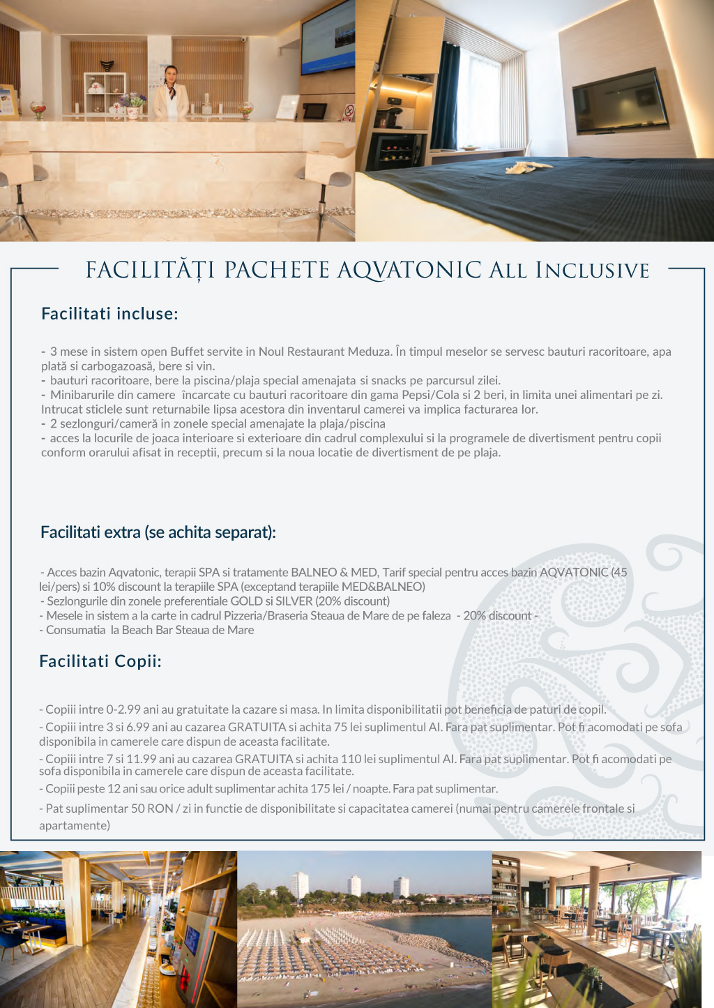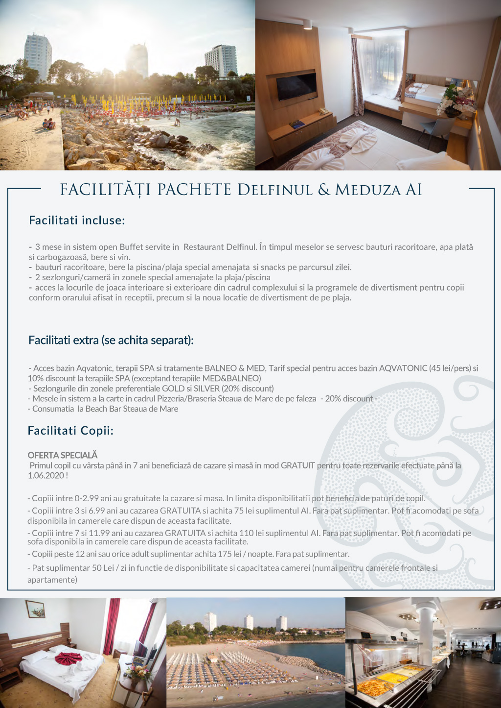 Vă invităm să consultați facilitățile și opțiunile incluse, alături de prețuri pentru fiecare unitate hotelieră (Hotelurile Delfinul și Meduza și Hotel Aqvatonic) si extraopțiuni.