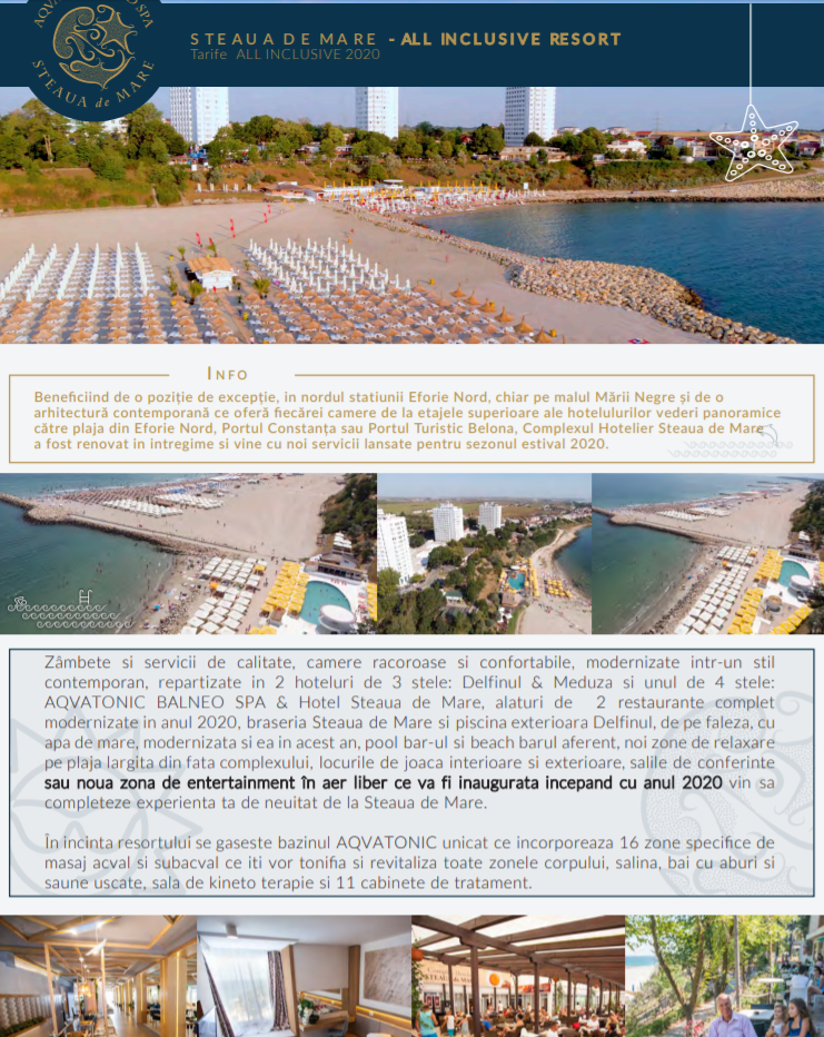 Dragi oaspeți și vizitatori, ne bucurăm să vă anunțăm că am lansat pachetele ALL INCLUSIVE pentru sezonul 2020 la Complex Hotelier Steaua de Mare!