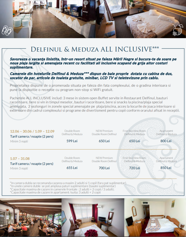 Regăsiți mai jos pachetele ALL INCLUSIVE complete, cu prețuri și perioade promoționale: