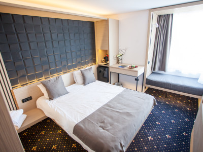 Cazare in camera dubla cu sofa, echipata cu LCD TV de 42″, internet wireless, minibar/racitor de vinuri, seif, fier de calcat, pat dublu, sofa pentru lectura la geam, espressor de cafea Dolce Gusto, aer conditionat, sistem de incalzire, sistem de acces pe baza de cartela si uscator de par.