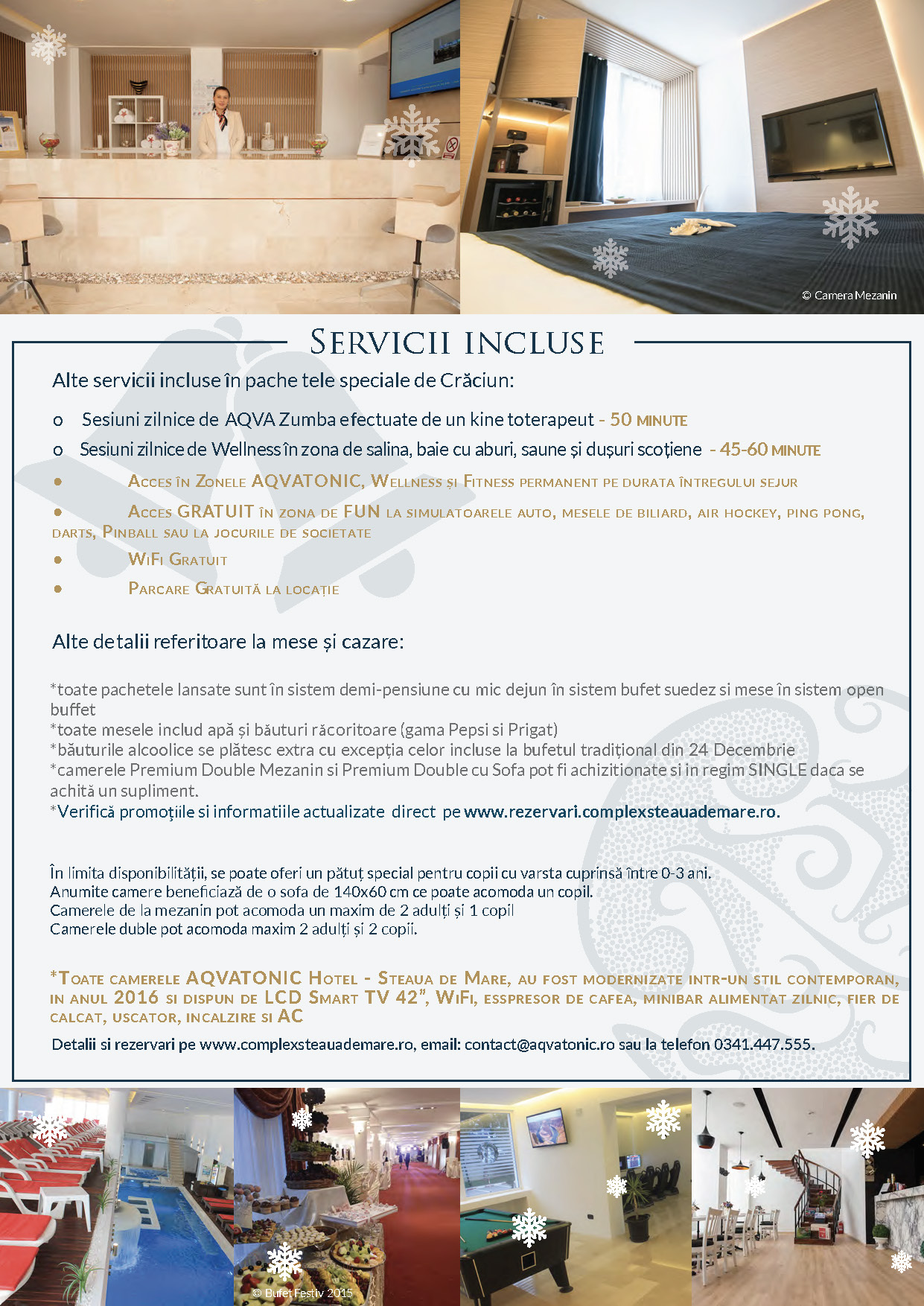 Pentru a beneficia de DISCOUNT intra pe www.rezervari.complexsteauademare.ro selecteaza tipul de camera si masa, masajele sau terapiile suplimentare (daca este cazul, accesul Aqvatonic nu trebuie selectat intrucat este inclus in pachet) si trimite mail cu numarul rezervarii pentru a se aplica discountul de EARLY BOOKING.