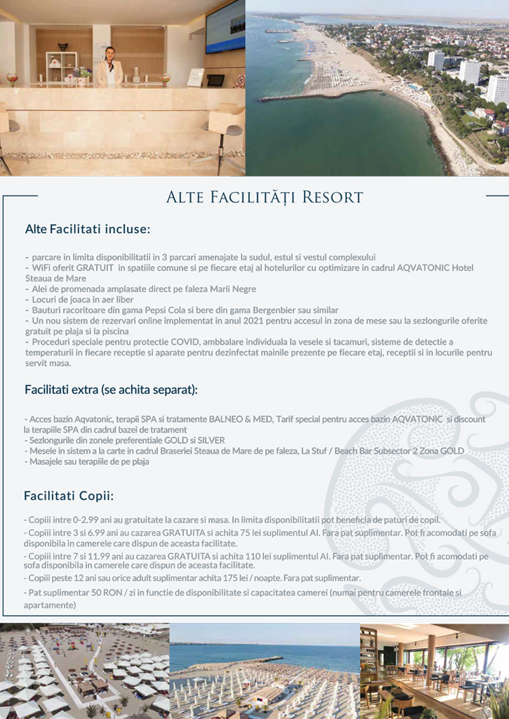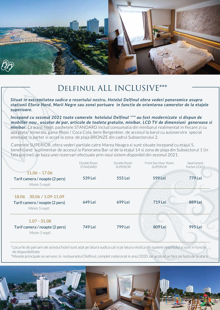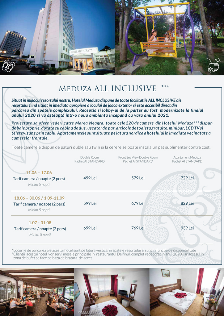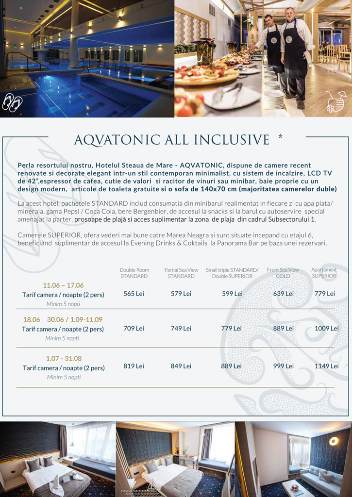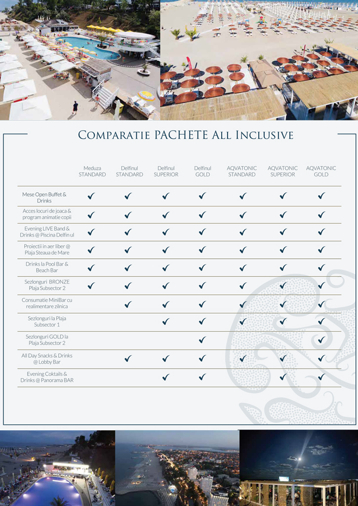 Vă invităm să consultați facilitățile și opțiunile incluse, alături de prețuri pentru fiecare unitate hotelieră (Hotelurile Delfinul și Meduza și Hotel Aqvatonic) si extraopțiuni.