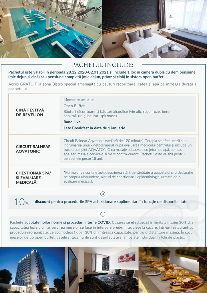 La momentul publicării ofertei nu sunt disponibile accesul la piscină interioară (cu scop recreativ / wellness) și accesul la facilitățile din zona de wellness (saune / băi cu aburi), până când nu vor fi emise noi decizii guvernamentale referitoare la aceste activități. Traseul AQVATONIC este permis numai în cadrul terapiilor balneare, cu norme stricte ce asigură o suprafață de minim 12 mp de apă pentru fiecare persoană ce efectuează terapia. În funcție de evoluția pandemică, dar și de diagnosticul individual al fiecărui oaspete, medicul specialist RMFB va putea înlocui anumite terapii dintr-o gamă cu altele din game care sunt permise.