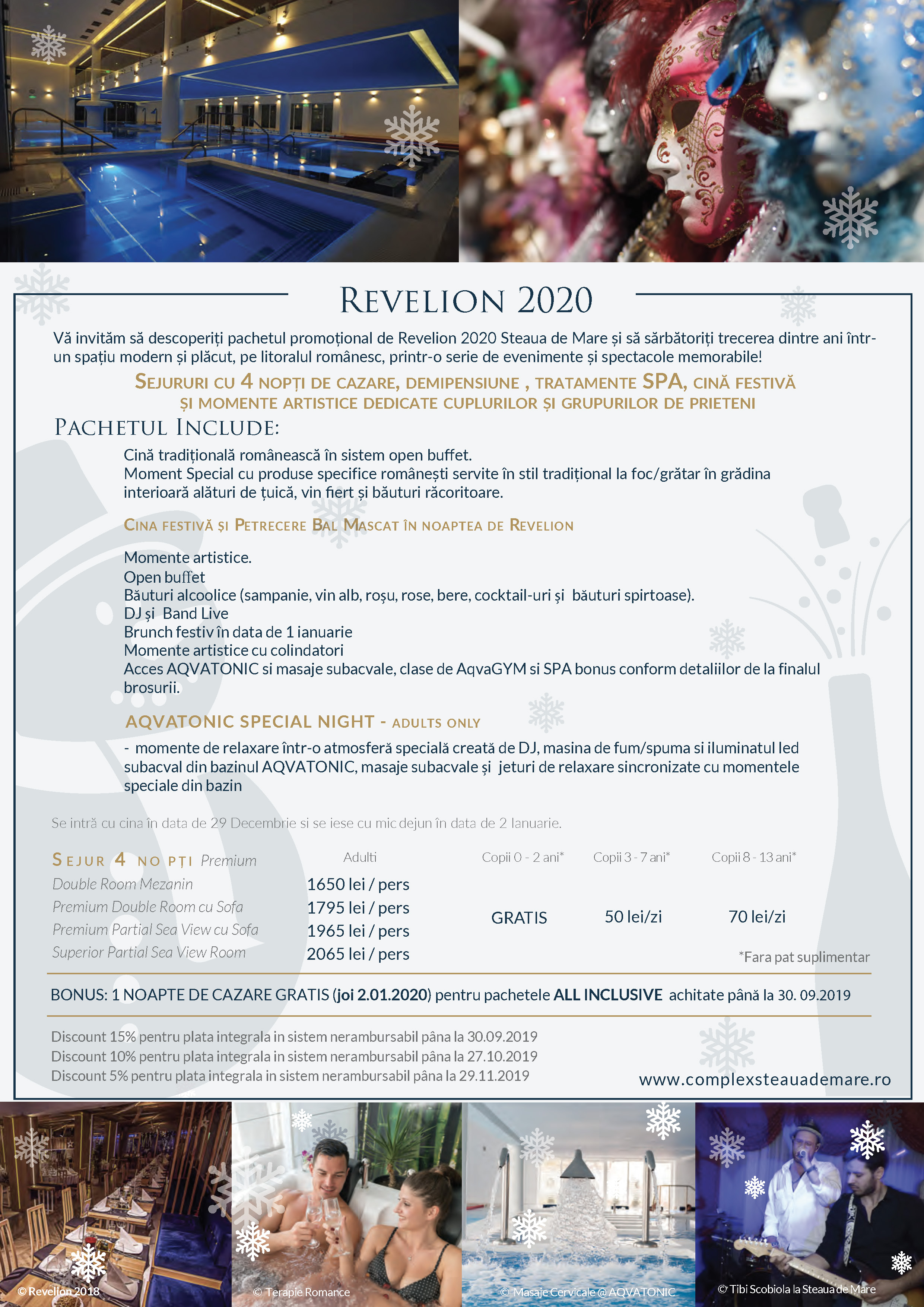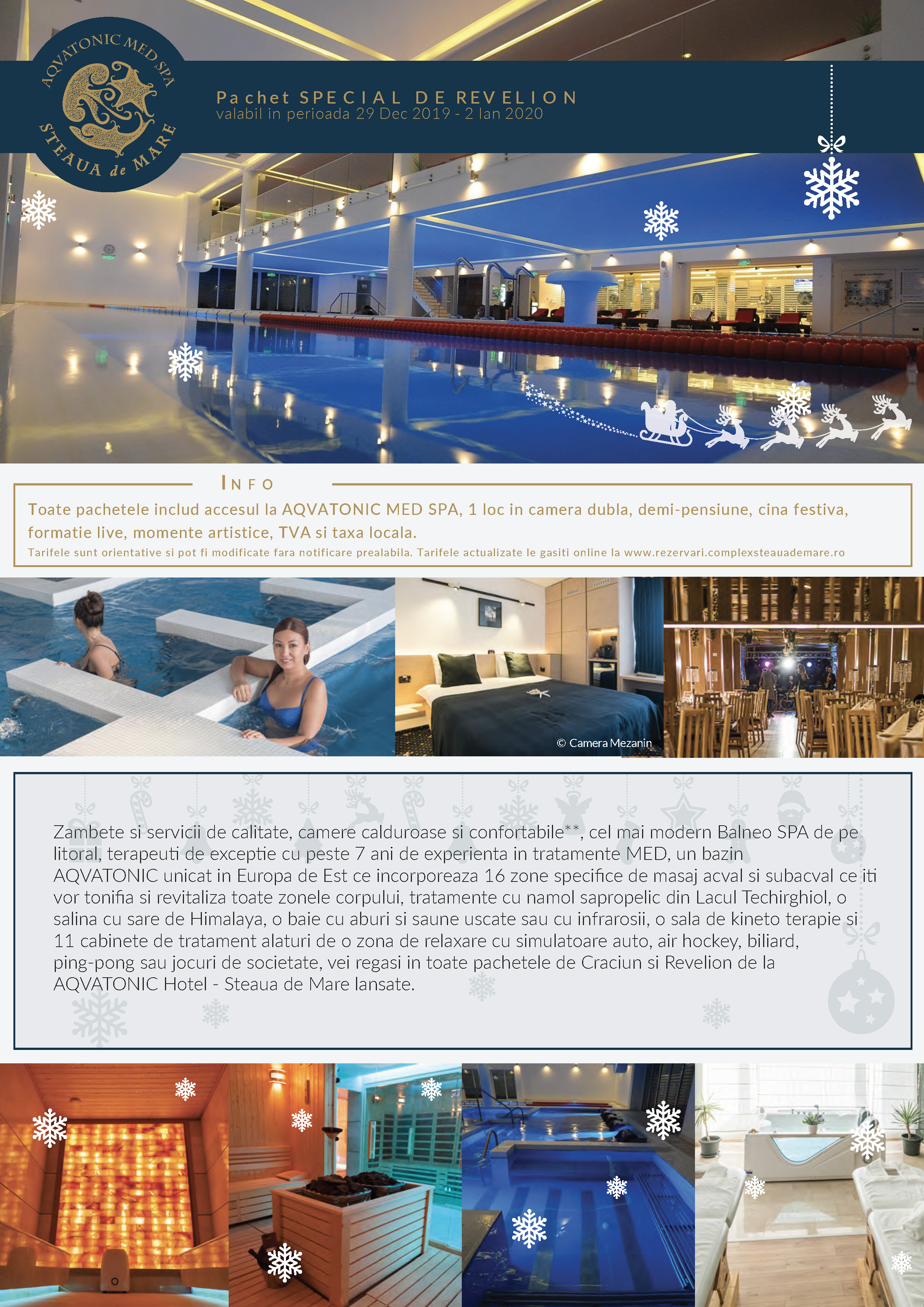 Vă invităm să descoperiți pachetul promoțional de Revelion 2020 AQVATONIC – Steaua de Mare și să sărbătoriți trecerea dintre ani întrun spațiu modern și plăcut, pe litoralul românesc, printr-o serie de evenimente și spectacole memorabile!